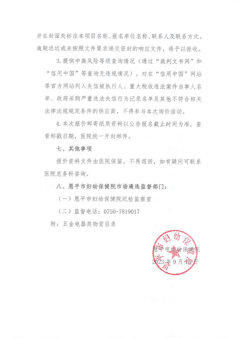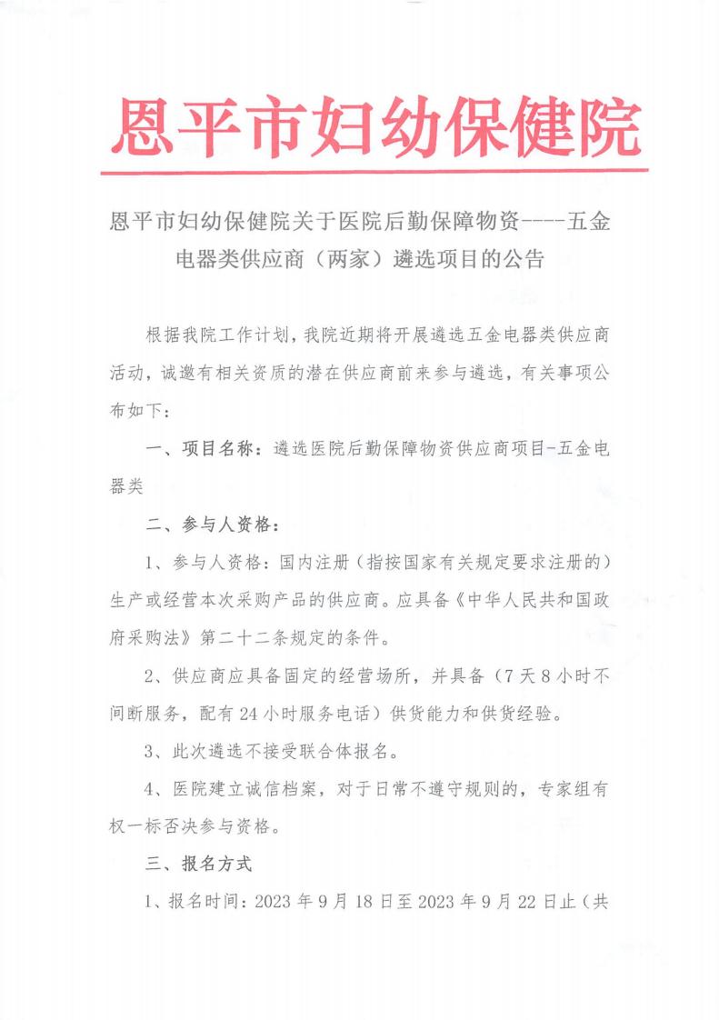 恩平市妇幼保健院关于医院后勤保障物资----五金电器类供应商(两家)遴选项目的公告