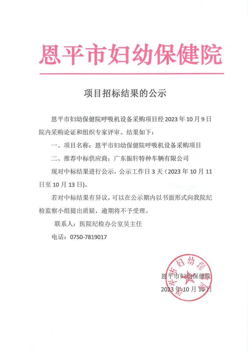 项目招标结果公示(呼吸机设备项目)
