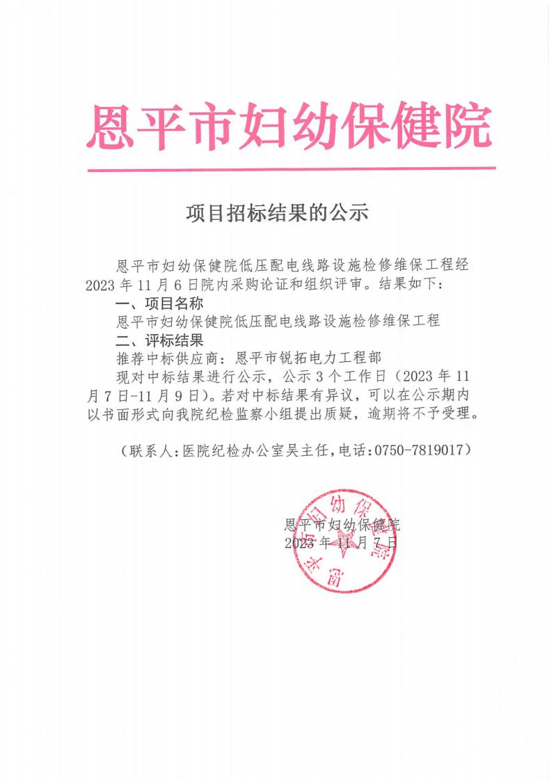 恩平市妇幼保健院低压配电线路设施检修维保项目结果公示