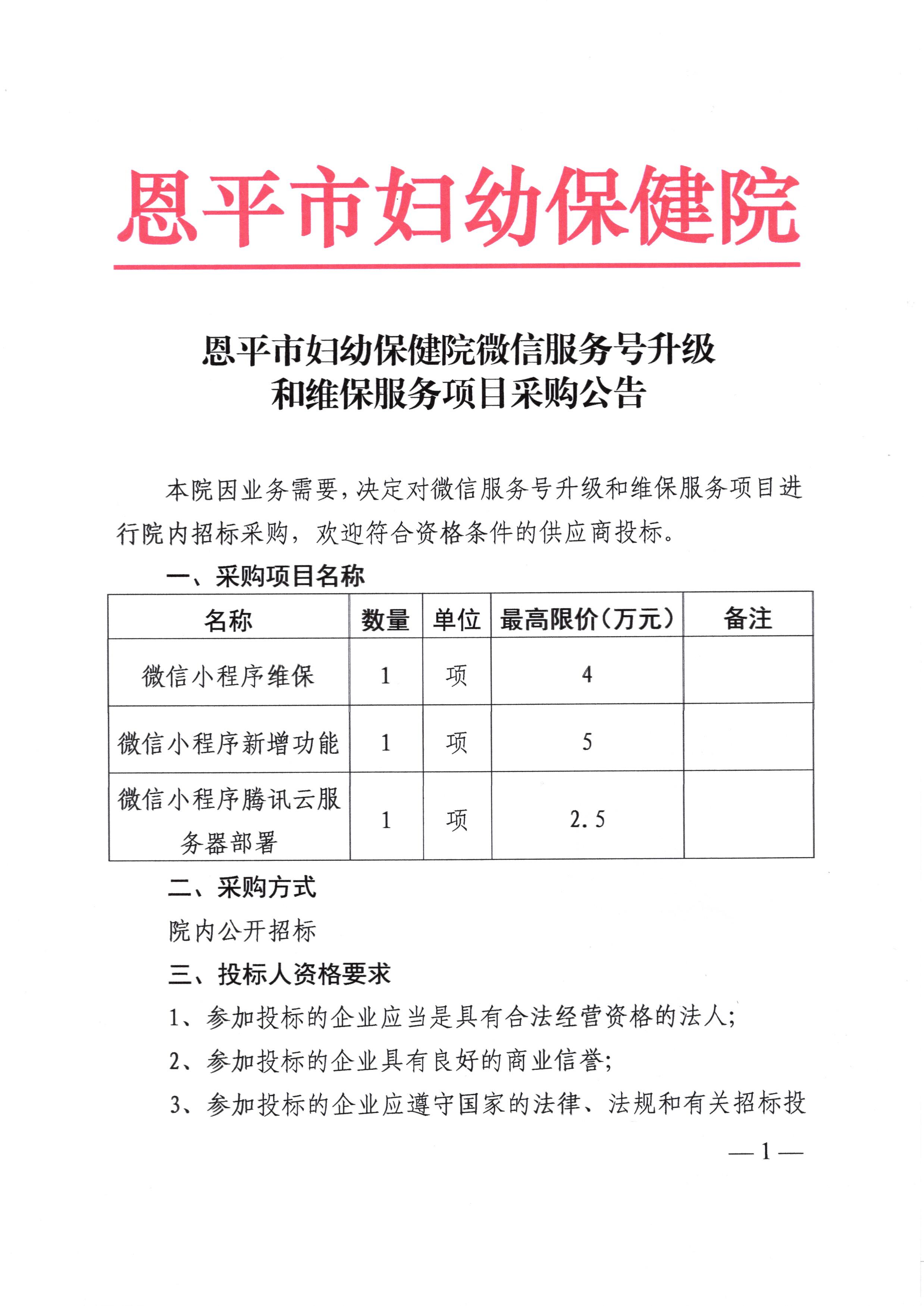 恩平市妇幼保健院微信服务号升级和维保服务项目招标公告